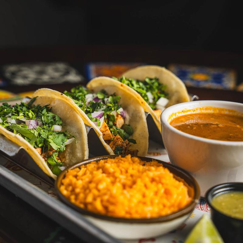 3 tacos served with your choice of tortilla soup or charro bean soup. Soft or hard tortillas.