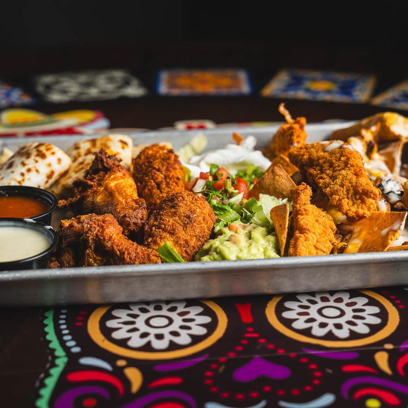 Grilled chicken, steak and shrimp served with lettuce. Pico de gallo, guacamole, sour cream and charro beans. Topped with cheese sauce.